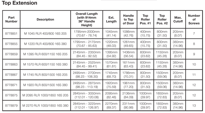 If you need a replacement Top Extension measure length and distance to top rollers, find part number below that fits your application and select it from the drop down menu above. Take note of maximum cutoff dimension as this is the maximum you can safely trim off the extension without affecting functionality.